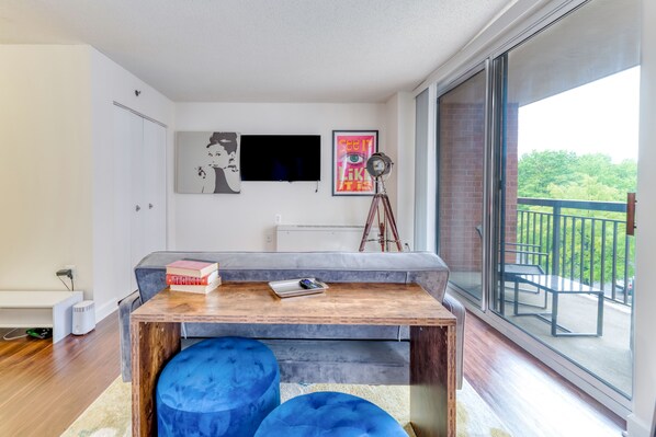 Admire the view of Crystal city from the sunlit patio of this luxury apartment. Pentagon Mall is next and D.C is 10 minutes away. The home has a fun, artsy feel while still feeling comfortable and inviting. The apartment has 1 bedroom with a queen bed, bathroom, a full kitchen, washer/dryer & internet. A queen air mattress or pack n play can be provided upon request.Perfect for one night or extended stays, weekly and monthly rates available. a stylish experience at this centrally-located place.