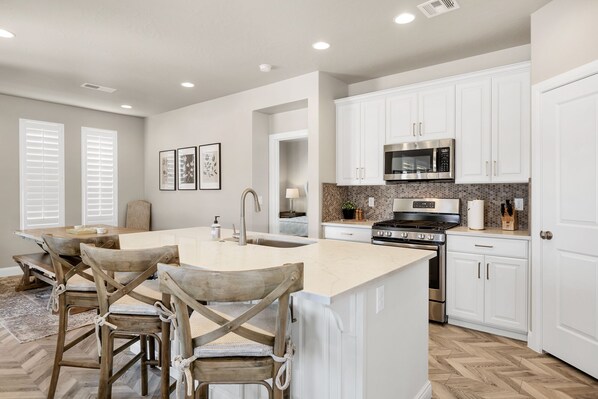 You will enjoy cooking and entertaining in this luxury kitchen. Featuring Stainless steel appliances as well as a side by side refrigerator featuring an icemaker, dishwasher, microwave, oven, and separate gas stove top. The kitchen is fully stocked with a Keurig coffee maker, teapot, crock pot, pressure cooker, blender, pancake grill, waffle maker, popcorn popper, toaster, spices, and a mixing bowls to enjoy baking. The dining table will seat 5 with an additional 3 bar stools at the bar. The living room has two comfortable couches and a large flat screen TV. You will also enjoy the large back patio with beautiful views. The patio has a BBQ, Table and Wrap around couch to enjoy the warm desert breeze and stunning views.