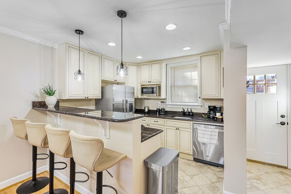 • Full-size appliances + dishwasher. • Coffee maker with complimentary coffee & tea. • Cookware, utensils, and dining essentials.