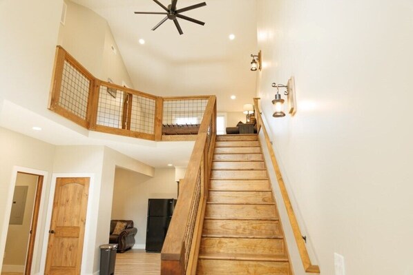 The 3 bedroom, 2 ½ bath Mabel’s Place, sleeps 6 and has one primary queen bedroom with primary full bath ensuite on the main floor while on the upper floor are two queen bedrooms and full guest bath. A guest half bath is located on the main living space floor. The large open living area with its overstuffed couch and loveseat features a large screen Fire TV perfect for streaming and logging into your own favorite apps. A formal dining table and full kitchen with brand new appliances, plus laundry closet with washer/dryer rounds out the main floor living space. Upstairs you will also find a loft sitting area complete with foosball table.