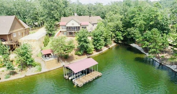 Open floor plan home features a fully stocked kitchen with pantry and tons of counter space, bar stools and large dining table for big family dinners. Features a lakeside bar/kitchen with grill and small table and seating just 6 steps from the water, private dock on the cove with great fishing (several fishing poles and tackle included). Master and a Guest Room on the main level each with an attached bathroom and TVs with Direct TV. All 4 rooms have cozy adjustable mattresses with lots of pillows! The daylight basement includes 2 bedrooms and another bathroom with lake views from every room. Living room has plenty of seating with lake view, gas fire place, 60" TV with Direct TV, and Bluetooth surround sound music system which can be extended to speakers on the screened-in porch and lower covered patio. The game room which includes a full sized pool table, ping pong table cover, poker set, large Bluetooth speaker plus assorted other games and TV to watch the Big Game or connect your favorite game console. Large back screened porch has lots of seating, outdoor dining table, gas fire place, chess set and gorgeous lake views. Also Includes large gas grill on the back deck. Lower porch has Adirondack chairs and rocking chairs overlooking the lake. 3 Kayaks are included along with life vests. Washer and dryer included in laundry room on main level of the house and there is an attached 3 car garage.