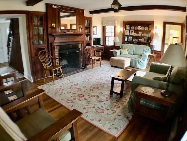 Amenities include central air, high quality furnishings, and a new front-loading washer and dryer in the basement. The eat-in kitchen is bright and cheerful including a dishwasher and plenty of space for meals – preparing and enjoying them! On the first floor is a cozy living room with a sizeable television and Apple TV4K, an airy screened-in porch including a convertible couch and a second television, two bedrooms (with cordless, room-darkening blinds!), and a full bath. On the second floor are two more bedrooms and a half bath. For cooking outdoors there is a gas grill and a charcoal Weber grill. Additionally, the property is regularly treated with organic mosquito control protection.