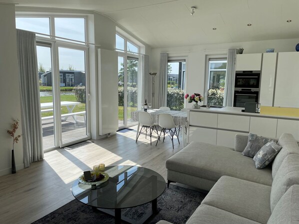 Vakantiehuizen Ruisweg Wemeldinge in Wemeldinge is a serene escape just 300 m from the sea and 1.5 km from the beach. Unwind in your modern bungalow with air conditioning, internet access, an open kitchen with appliances, and two terraces overlooking the lake.