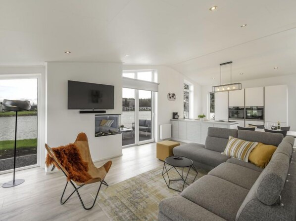 "Ruisweg 28", 3-room bungalow 93 m2. Comfortable and modern furnishings: entrance hall with separate WC. Living/dining room with dining table and flat screen. Exit to the terrace. 1 double bedroom with 2 beds (80 cm, length 200 cm). 1 double bedroom with 2 beds (90 cm, length 200 cm). Open kitchen (oven, dishwasher, 4 induction hot plates, toaster, kettle, microwave, freezer, electric coffee machine, cooking island). 2 showers. Electric heating, Electric fireplace. Terrace. Terrace furniture, deck chairs (2), box-room. View of the lake. Facilities: washing machine, sauna, hair dryer. Internet (WiFi, free). Parking (2 cars) at the house. Please note: non-smoking house. Smoke alarm. Bookings accepted for holiday purposes only. A deposit of 100 EUR per person can be charged on site.