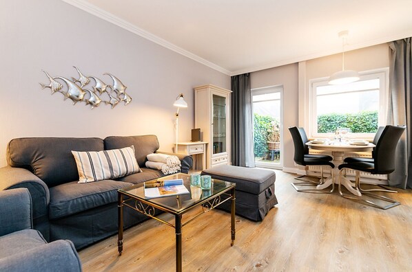 Austernperle - 3-room vacation apartment on the ground floor for max. 3 persons with terrace & balcony. provides laundry facilities and more. Treat yourself to a massage or other spa services. Stay connected with in-room WiFi.