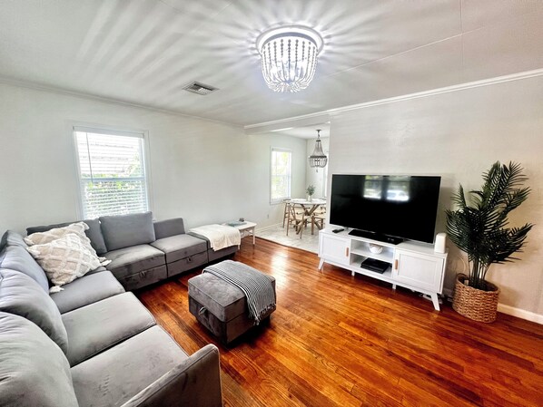 Stylish Comfy Bungalow- 10 minutes to the beach. Backyard w/ deck & Grill. provides laundry facilities and more. Stay connected with in-room WiFi.