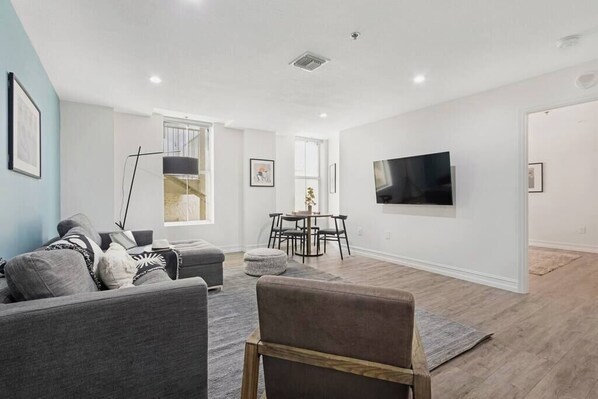 Find large smart TVs in the bedroom and living room and complimentary fast Wi-Fi.