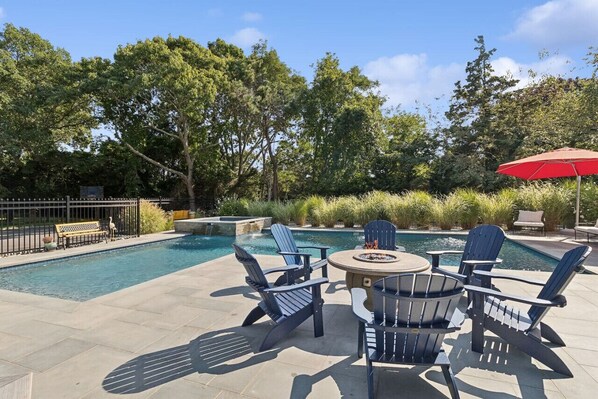 One of the crowning features of this property is the pristine Gunite salt-water pool, inviting you to soak up the sun and revel in the soothing embrace of its refreshing waters. Adjacent to this aquatic oasis is a 12-person hot tub complete with a captivating waterfall feature, creating a private haven of relaxation and rejuvenation.