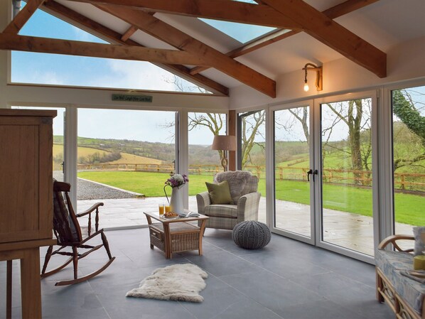 Enjoy waking up from the master bedroom with a coffee and sitting on the balcony whilst listening to bird song and taking in these sublime views. After a busy day, soak in the free standing bath at the bottom of your bed. Each bedroom has been lovingly furnished to a high standard and all boast their own en-suite bathrooms. On the ground floor the large open plan living space offers an amazing place to socialize. The cosy living area includes a focal wood burner and the original horse feeder, leading onto the large sunroom with French doors leading out onto the patio area where you can enjoy dining al-fresco with a barbecue or watch the kids play. The kitchen/dining area provides a fantastic space for formal dining with a well-equipped contemporary style kitchen.