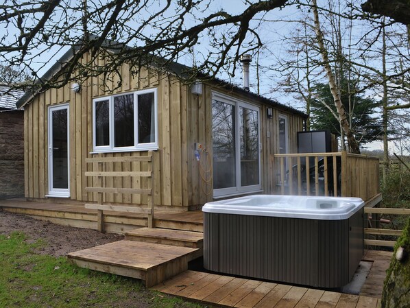 Feel like you are floating amongst the tree tops in this comfortable lodge with a private jacuzzi hot tub and a cosy wood burner.. 1 step to entrance.