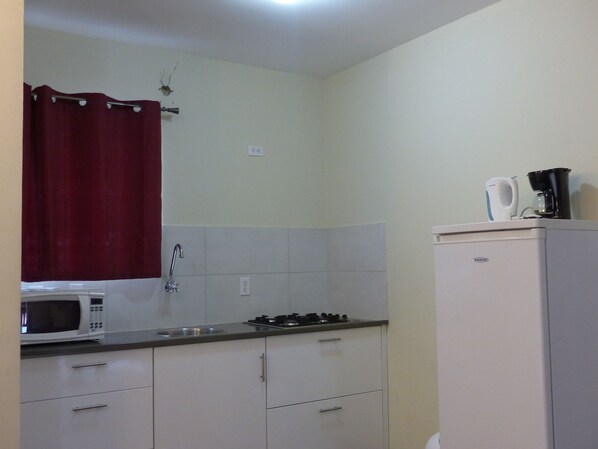 The apartment includes a fully equipped kitchenette with a stovetop, microwave, electric kettle, and refrigerator. There is a dining area with a dining table, as well as a living room with a flat-screen television. Guests can enjoy free Wi-Fi and cable TV throughout their stay.