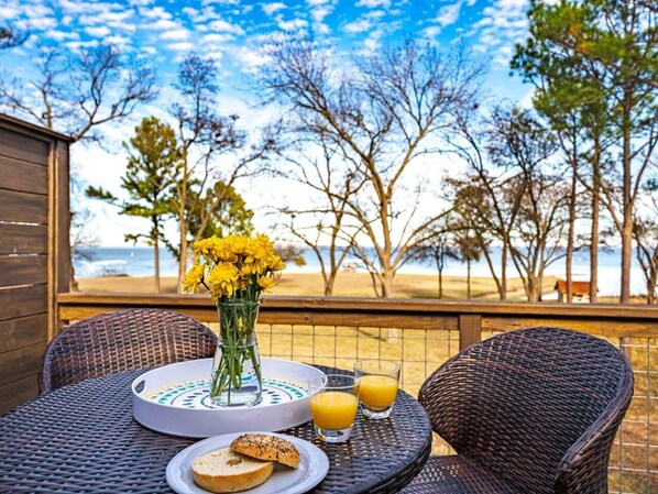 Mornings start off right with a breathtaking lakeside sunrise and coffee on your deck. Make breakfast in your full kitchen, which is well-stocked for real cooking! Eat outside on the deck, or at the 4-person mid-century modern dining table in the kitchen.