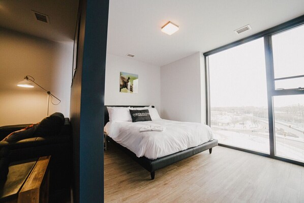 This apartment offers a tranquil studio, featuring a queen-size bed and scenic neighborhood views for restful nights. A full bathroom with high-end fixtures provides the perfect setting to refresh and rejuvenate.
