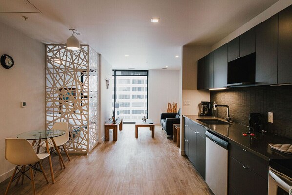 This apartment offers a tranquil studio, featuring a queen-size bed and scenic neighborhood views for restful nights. A full bathroom with high-end fixtures provides the perfect setting to refresh and rejuvenate.