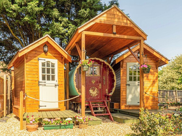 External kitchen: With electric oven, hob, microwave and fridge.. Underfloor heating, electricity, bed linen, towels and Wi-Fi included. Enclosed garden with decking, garden furniture and gas barbecue. Lazy spa hot tub for 2 (private). Parking. No smoking.. Brimming with traditional charm and character, this authentic travelling abode has been expertly equipped with a variety of added indulgences including its own private lazy spa hot tub for a relaxing soak. The property has been delightfully designed with separate kitchen and bathroom huts sitting conveniently either side. Guests can enjoy a selection of deluxe amenities including underfloor heating in all three spaces, high-speed Wifi to keep you connected as well as full bathroom facilities with a hot rainfall shower and flushing toilet. The site is wonderfully positioned on the border between Norfolk, Cambridgeshire and Lincolnshire offering an interesting mix of things to do and see, combined with a cosy space to unwind and snuggle up in the evenings. The caravan and adjoining shepherds huts are set in their own private garden sheltered by a large garden fence with trees and shrubs around the outside. You will find outdoor decking and sun area to sit out and enjoy the warm summer evenings. In addition, the site is home to a few lovely goats all with their own distinctive character, which adds to the authentic appeal of the place.
