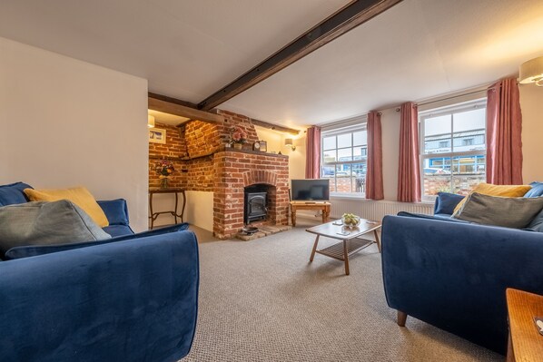 Escape to The Town House, a charming cottage in a quiet village close to Woodbridge and Sutton Hoo. Unwind in the sitting room with original exposed stonework and beams, luxurious velvet sofas, and a cosy fire or enjoy meals prepared in the bright kitchen with lovely views over the fully enclosed garden.