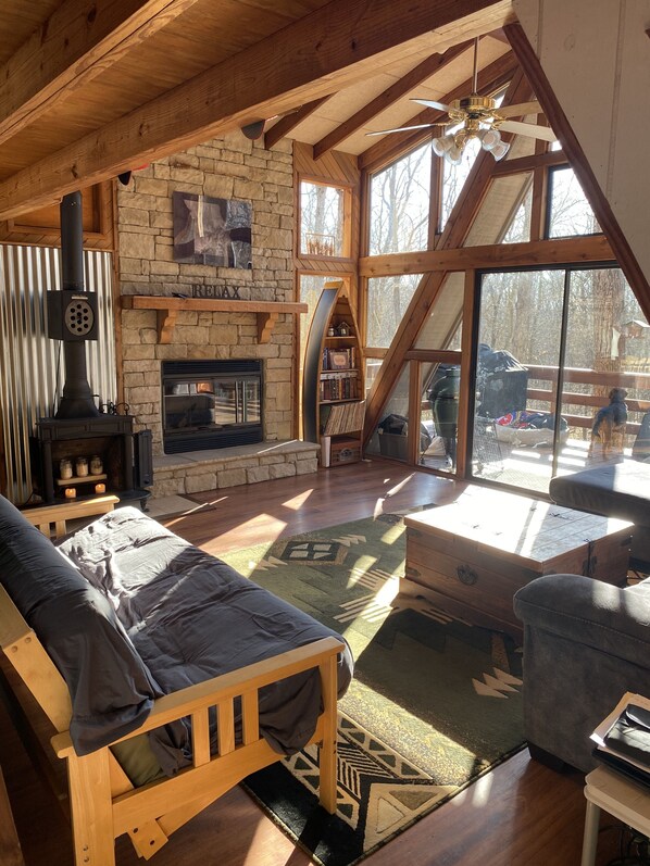 There is always hot water with our tankless hot water heater. We have full size washer and dryer in the cabin and available for use. We also have a propane grill, a Weber grill, an 11' shade umbrella, outdoor rail lights, table and seating. Down the stairs, off the deck, We have a large outside firepit with bench seating. The cabin is just 300 yards from Innsbrooks premier Alpine Lake boat launch and dock where you can find some of the best fishing at innsbrook!