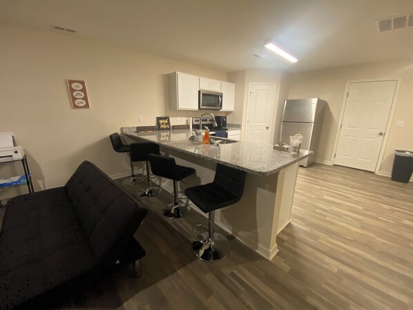 Each bedroom comes equipped with a Queen sized mattress and frame with an L-Shaped Desk for studying or remote work, also 3 43’ Amazon Prime TVs and a 55’ smart TV that even Bluetooth your phone! Also each closet comes equipped with hangars. There are 2 futons in the living room with a kitchen stocked with whatever pans, pots, or utensils hopefully you may need!