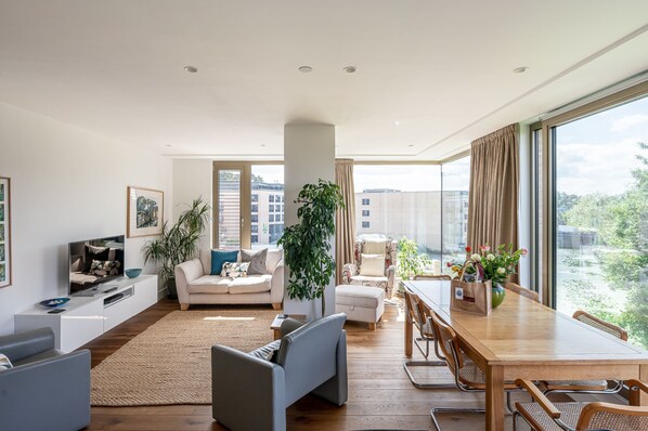 You wouldn’t know you were in the centre of York! The view from the main living room was of the River Foss and trees, so peaceful. A very comfortable and practical living/ dining/ kitchen area. Spacious bedrooms with good showers, and a bath! 2 parking spaces, a bonus in York! Only a few minutes walk into York itself. You must try the restaurants in Walmgate, 2 minutes away. The Thai, Italian, Yemen and Polish restaurants all superb. Enjoy!