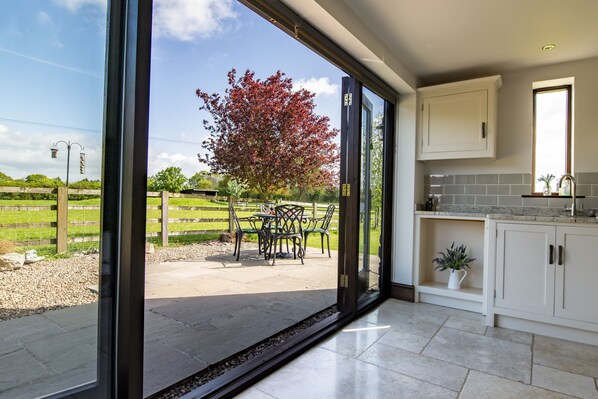 Surrounded by farmland, Tockwith Lodge Barn offers a serene retreat between the City of York and Harrogate. Enjoy open-plan living with vast vaulted ceilings and french doors opening out into the extensive garden, perfect for barbecues or feeding chickens.