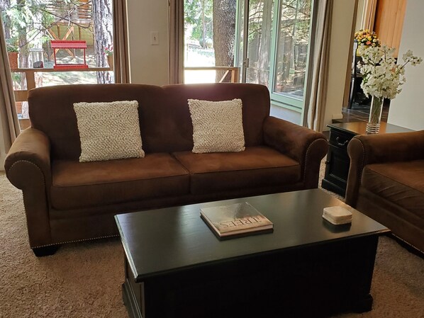 Tucked away in Yosemite National Park, this unique cabin offers a tranquil retreat. Unwind in the relaxing Jacuzzi or enjoy nature's beauty from the stone patio with BBQ and creek views. Inside, cozy up by the big screen TV or unwind with a book in the library area.