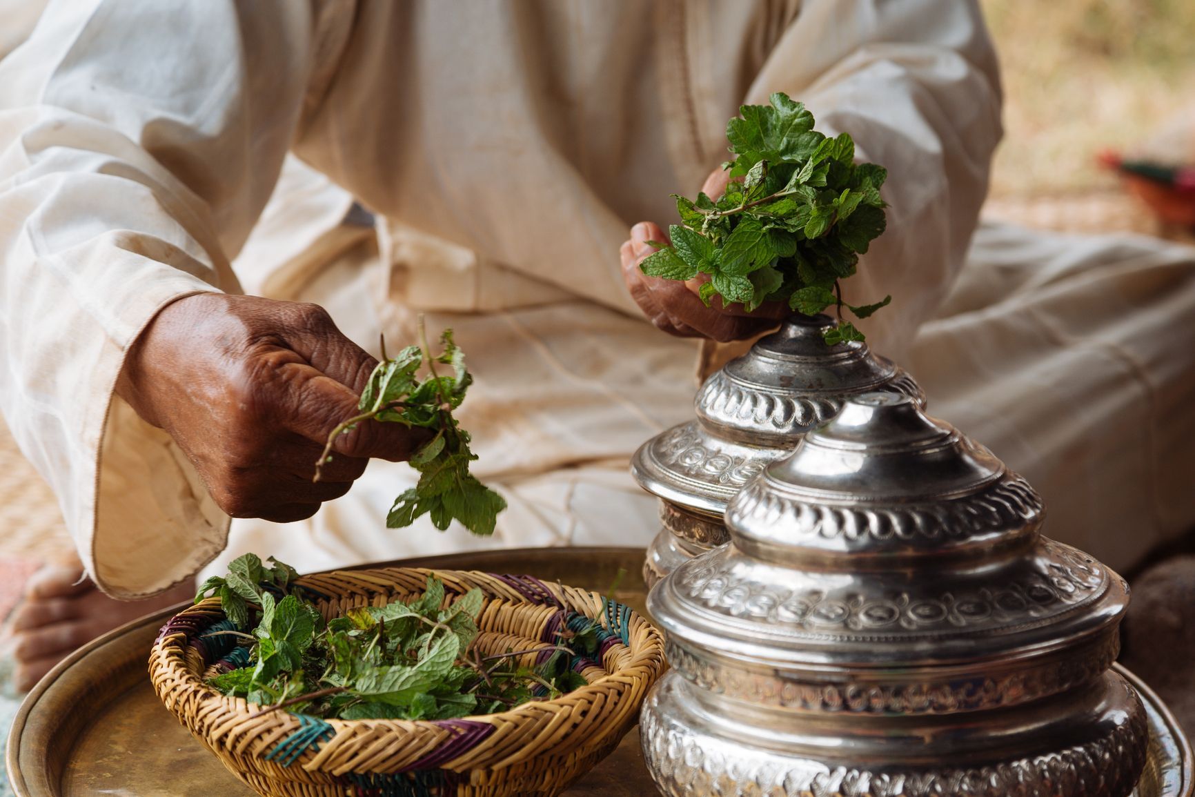 Native to Morocco, the herbal tea tradition involves combining fresh local herbs – such as mint, absinthe, verbena or rosemary – with sugar, water and gunpowder green tea, a variety in which each leaf is rolled into a small pellet. After rinsing the tea and extracting its essence, the ingredients are carefully combined, and the tea is aerated by pouring it from increasingly impressive heights. Served from ornate Moroccan teapots in delicate glasses or inherited tea sets, the age-old ritual transcends refreshment and represents a moment of reconnection, generosity and mindfulness across the country.
