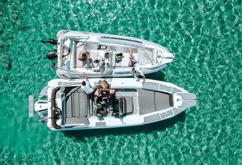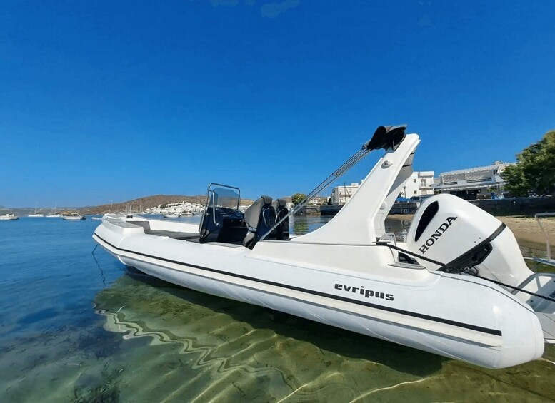 Experience the thrill of exploring South Milos on an 8.5-meter RIB powered by a new 250hp Suzuki outboard engine. The boat is equipped with a 9” Simrad GPS Chartplotter, a Bluetooth stereo with marine speakers, a sun awning, and ample storage space.