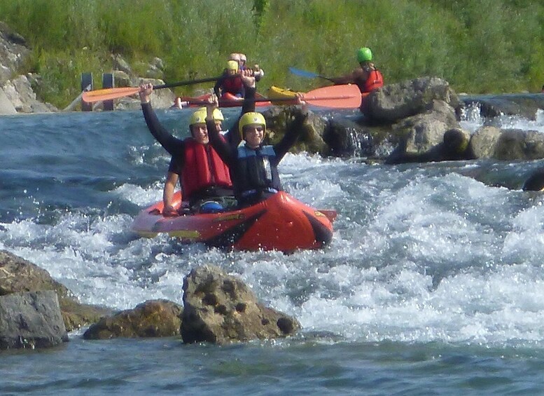 For canoe rafting, we use small and agile inflatable canoes instead of the large, guide-controlled rafts. You'll be steering this boat yourself, with two, three, or four people.