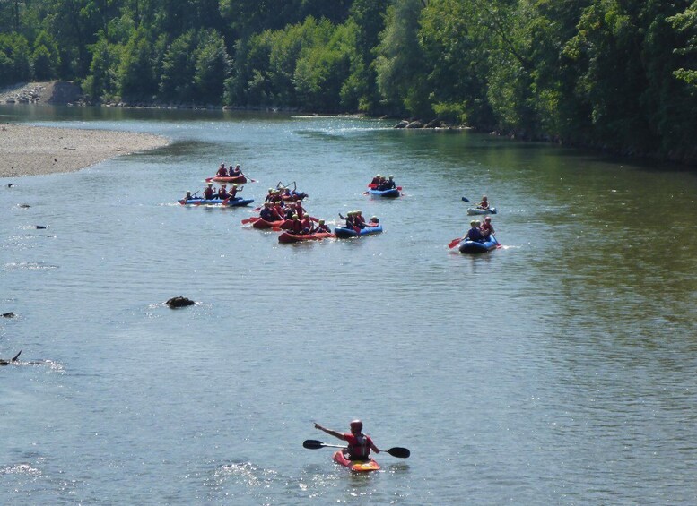In teams of 2 to 4, we'll paddle different river sections with varying difficulty in inflatable, tilt-resistant canoes.