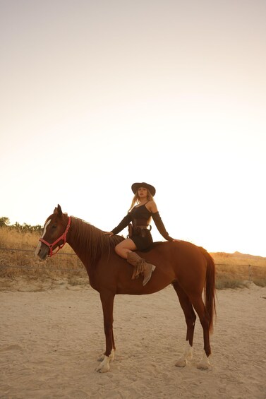 Immerse yourself in the captivating and free-spirited atmosphere of running horses with a professional photo and video shoot at a beautiful horse ranch. This experience takes place entirely at the ranch, where both the shoot and the included specially designed horse-style costumes are provided for you. Horses always complete 5 laps during the session, and photos and videos are captured throughout these laps. You have the flexibility to choose which laps are recorded for photos, videos, or both, ensuring the shoot matches your preferences and vision.