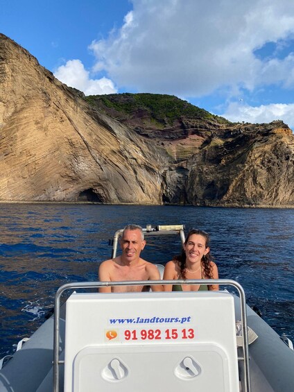 By boat, it will be a trip from Velas, passing through Queimada and Urzelina, with unique landscapes of the island seen from the sea, observation of volcanic cavities on the slopes, and a visit to some caves. Here, you can also stop and swim inside volcanic cavities (caves).