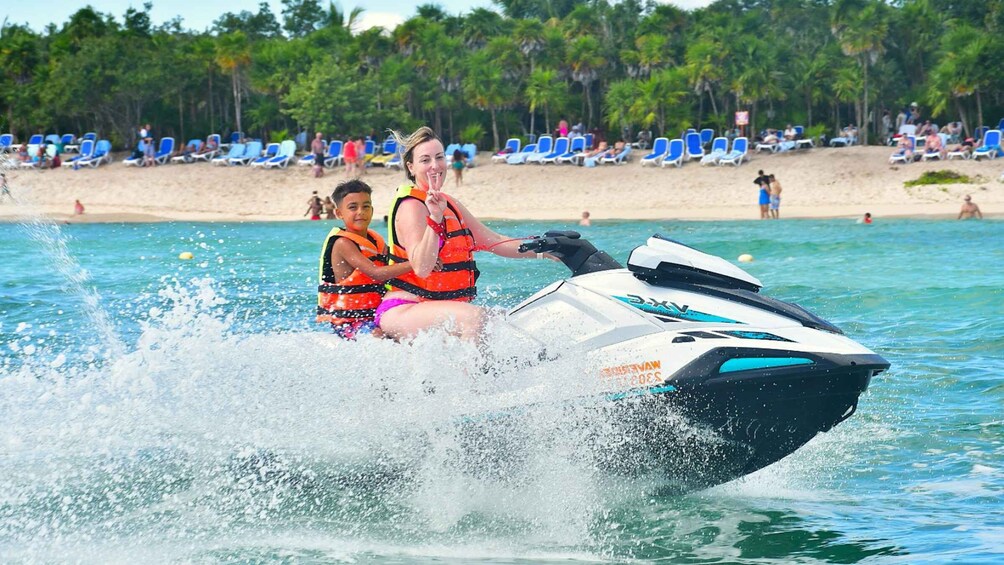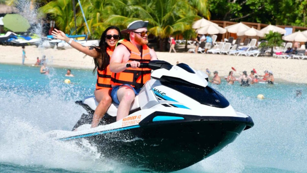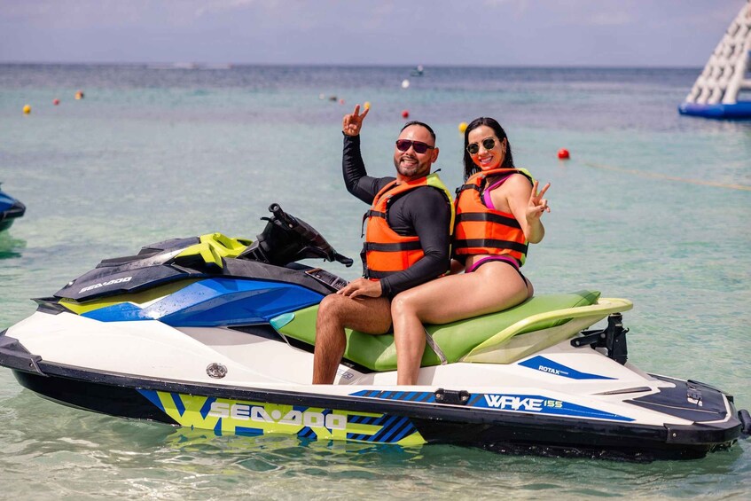 Dare to enjoy an incredible experience aboard a powerful Jet Ski on the beautiful island of Cozumel. You will navigate 1 jet ski with capacity for up to 2 people, in front of San Francisco beach for 30 minutes. The service includes instruction on the limits of the area of use of the jet ski as well as the safety measures on board it. Up to 2 changes of passenger and driver can be made. The use of life jackets is mandatory for safety measures. To drive the jet ski individually, the minimum age will be 16 years old with prior authorisation from a parent or guardian. The area of use of the jet ski is 4000 metres long.
