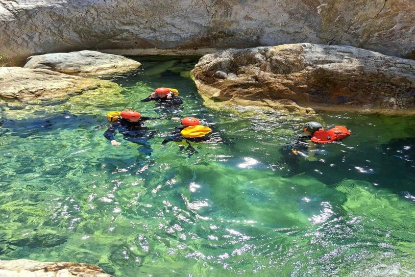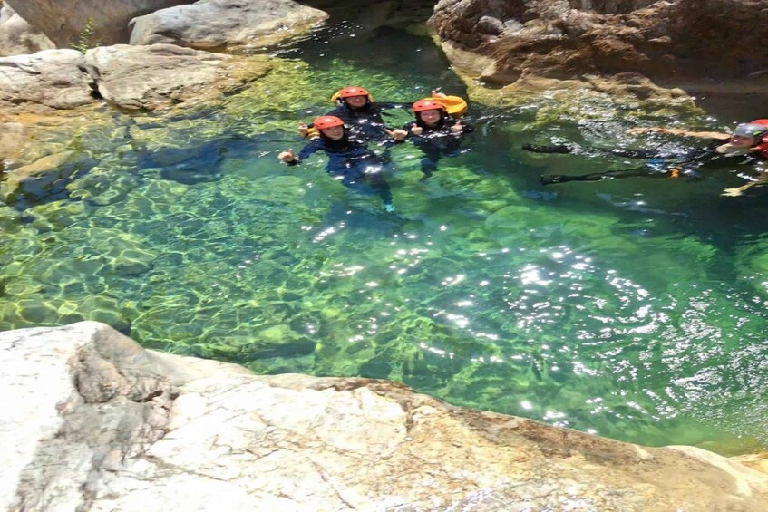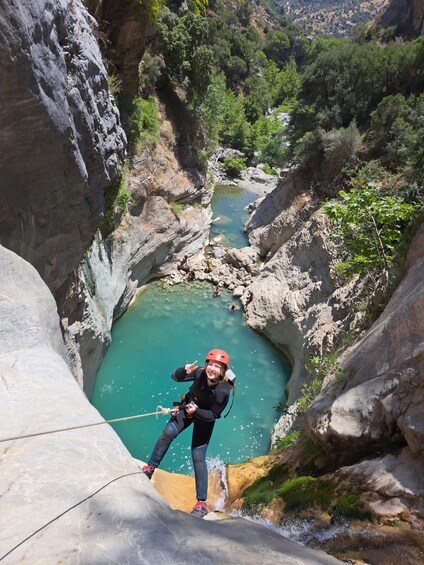 Your adventure begins in the mountain village of Manikia, where you meet your guides, get fitted with your wetsuit, harness, helmet and technical gear, and receive a full safety briefing. After a short approach hike through a lush valley with views of towering limestone cliffs, you reach the entrance of Manikia Canyon and step into a world shaped entirely by water.
