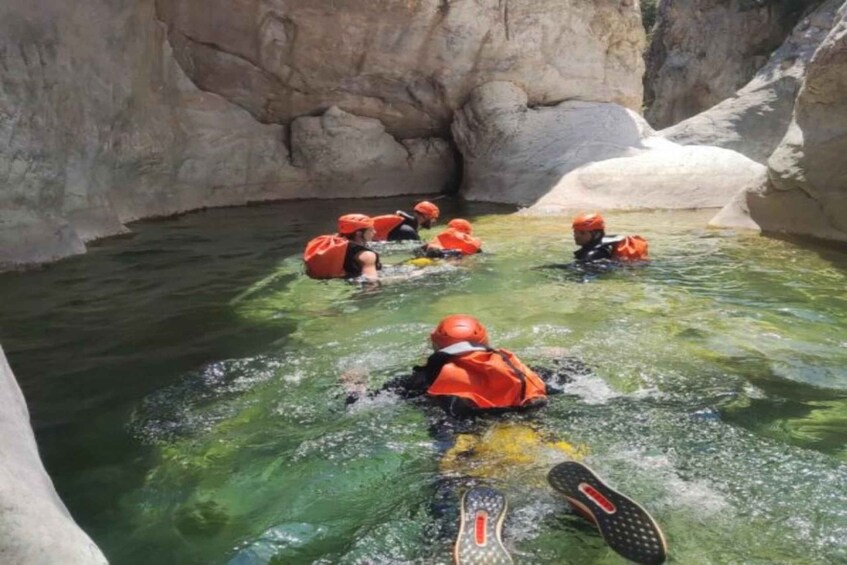 The experience starts gently, allowing you to get comfortable moving in the canyon environment. You walk and wade through shallow sections of the stream, learning how to position your body on wet rock and how to move safely as a team. The canyon walls gradually rise higher around you, narrowing into impressive rock corridors carved smooth over centuries.