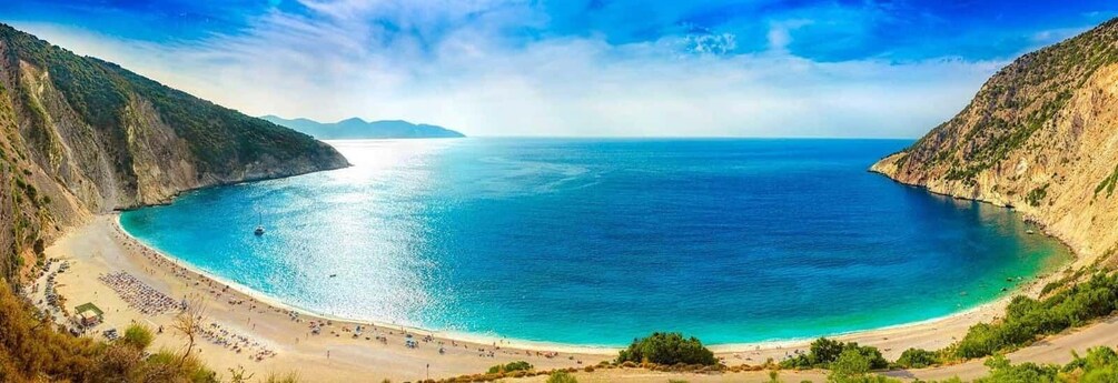 Myrtos beach photo stop , the most beautiful beach on the island and one of the most beautiful beaches in Europe, with snow white sand, a paradise on earth is protected by high rocks while the sea offers sublime combinations with colours ranging from blue green to deep blue.