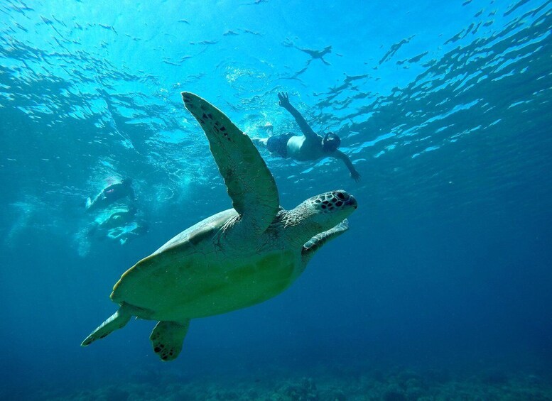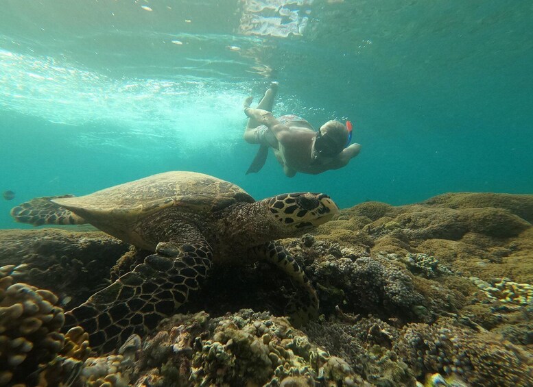 Once everyone is ready, the group boards the boat directly from Gili Air’s shoreline and sets off across calm, shallow waters. The first snorkelling stop is usually near Gili Air, allowing customers to ease into the experience. As soon as they enter the water, they are greeted by colourful coral reefs, tropical fish, and excellent visibility. The guide remains close, pointing out interesting marine life and making sure everyone feels confident and safe.