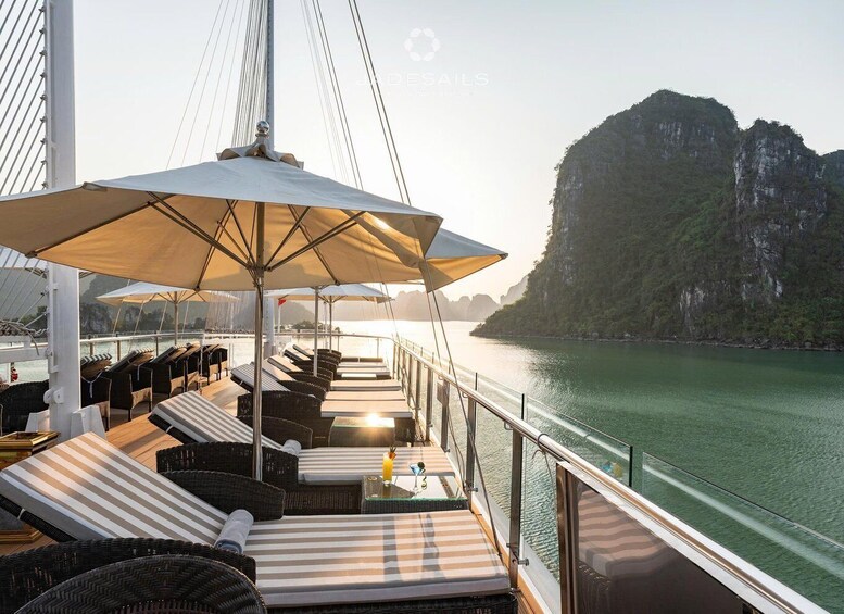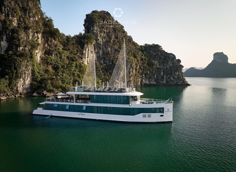 By mid-morning, step aboard the Jade Sails, one of the most luxurious day cruises in Lan Ha Bay. Be greeted by the crew and enjoy a welcome drink as you set sail among emerald waters and limestone karsts.