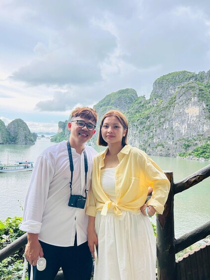 Enjoy a flavourful Vietnamese lunch as the boat sails among towering limestone pillars. Capture iconic sights such as Dog Rock, Incense Burner, and the legendary Fighting Cock Islet—the proud symbol of Halong Bay.