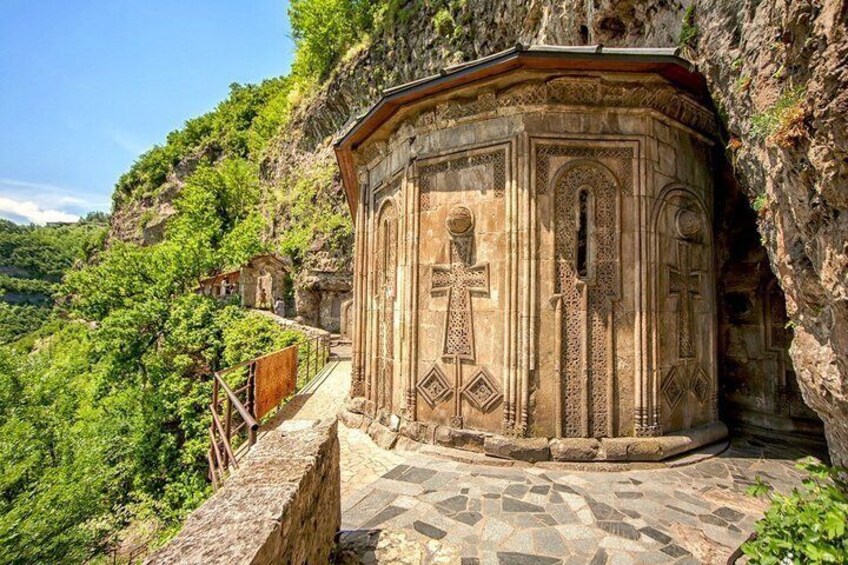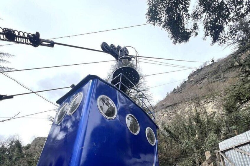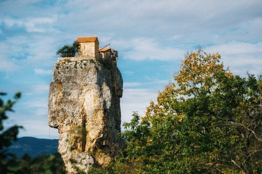 Katskhi Pillar: Unique 40-meter limestone monolith with a small church on top. Chiatura: City in Imereti cable cars, and rocky landscapes. Mghvimevi: Monastery in caves, a place of holiness and calm.