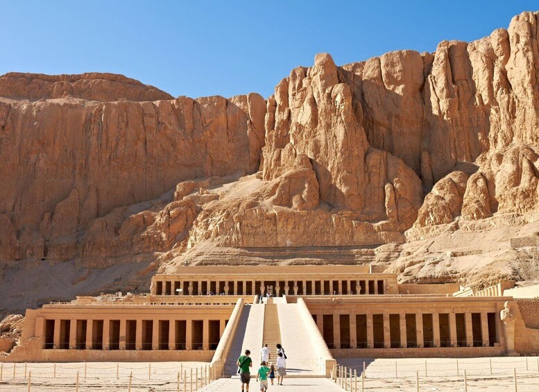 Then, head to the Mortuary Temple of Queen Hatshepsut. Located opposite the city of Luxor, it is considered to be a masterpiece of ancient architecture. Marvel at 3 massive terraces that rise above the desert floor and into the cliffs of Deir el-Bahari