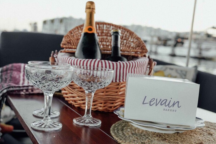 During your cruise, savour a curated picnic on the water with gourmet sandwich options such as Crispy Chicken, Farm Club, Caprese, Chicken Pesto, and Chimichurri Steak, along with an Avocado & Quinoa Superfood Salad, Basil Pesto Shells, and cookies.