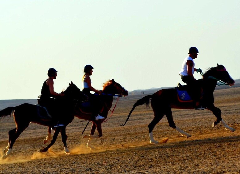 Includes pickup from Coraya Bay or airport areas. Ride for 4 hours through scenic desert and shoreline trails, ending with a memorable swim stop in the Red Sea with your horse.