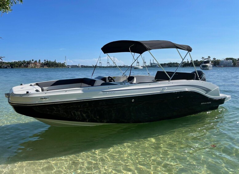 Cruise the sparkling waters of Miami while enjoying your own playlist on our Bluetooth sound system. Sip on a complimentary bottle of champagne and enjoy the provided water, ice, and cooler for any extra drinks you bring.