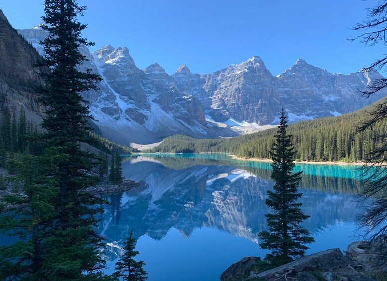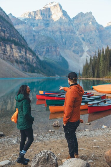 For a truly magical experience, choose our golden hour evening tour to Moraine Lake, where you’ll witness the sunset cast breathtaking light over the peaks and waters. Pickup times vary depending on sunset and shift as the days grow shorter.