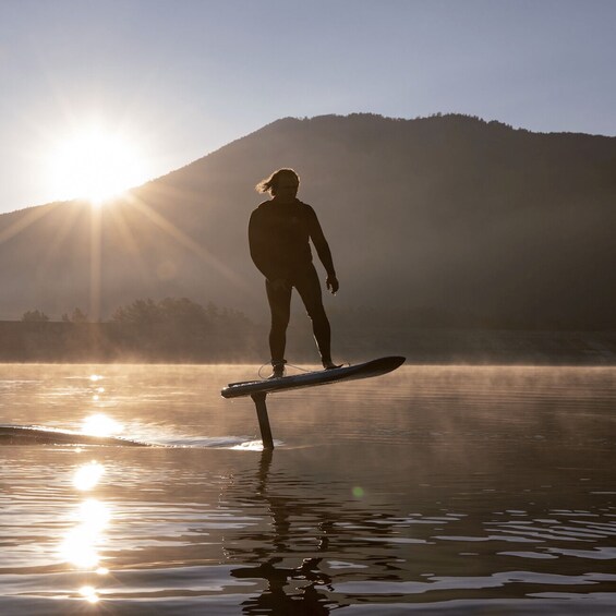 Embark on this electrifying journey as you strap yourself onto a specially designed electric hydrofoil board. Powered by a quiet and eco-friendly electric motor, this futuristic watercraft allows you to effortlessly hover above the water and explore the Fjord in a whole new way. As you gently accelerate, you'll experience the sensation of flying as the board lifts off and glides above the water's surface.