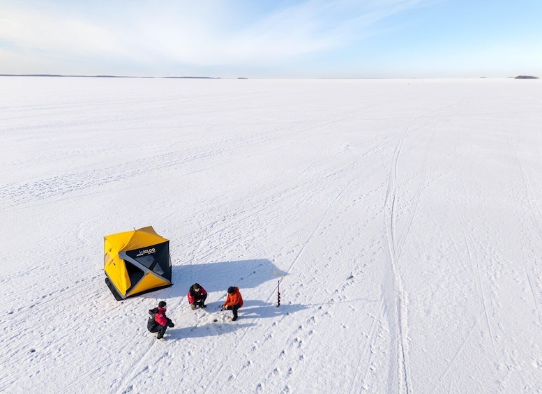 Once at the fishing site, everyone gets the chance to drill their own hole in the ice. Our experienced fishing guide will then show you how to bait the hook and use small movements to lure fish beneath the ice.
