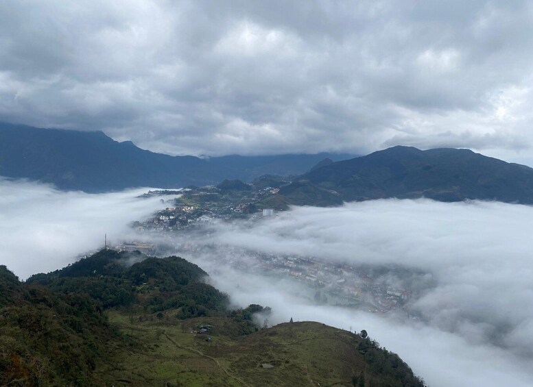 Reaching the Cloud Terrace – Heaven's Gate, Sa Pa appears hazy amidst a sea of clouds, with the Muong Hoa Valley and the majestic Fansipan peak in the distance. Here, visitors also have the opportunity to enjoy traditional dance and song performances by the H'Mong and Dao ethnic groups, adding vibrancy and a rich cultural identity to the highland region.
