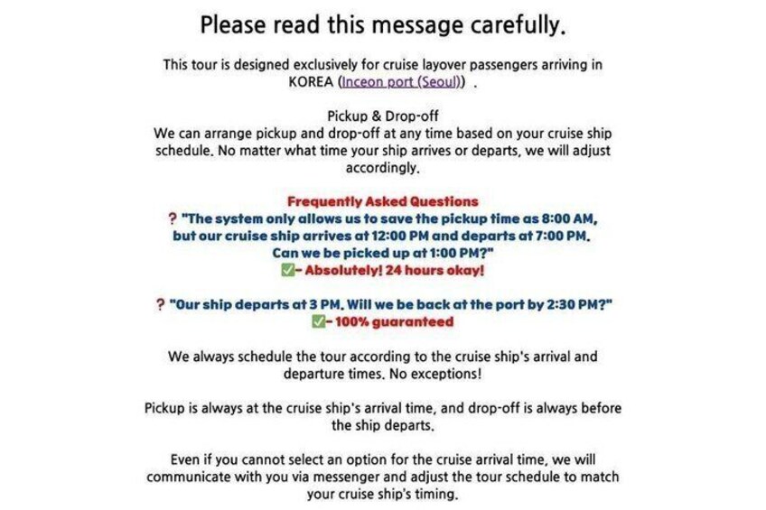 - [Cruise Information & Communication] Please provide your cruise ship name and a valid contact number (with country code) in the “Special Requirements” section for pickup arrangement. We will contact you via WhatsApp before the tour, so please ensure your number is available.