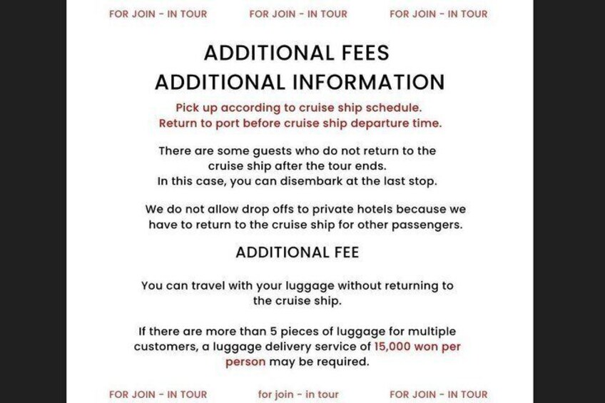 - [Pickup & Meeting] Your guide will be waiting at the cruise terminal exit, holding a “LOVE KOREA” sign.