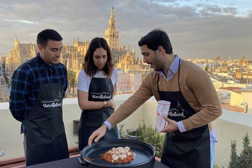 Sevilla: Panoramic Highlights Rooftop Tour & Paella Cooking Class